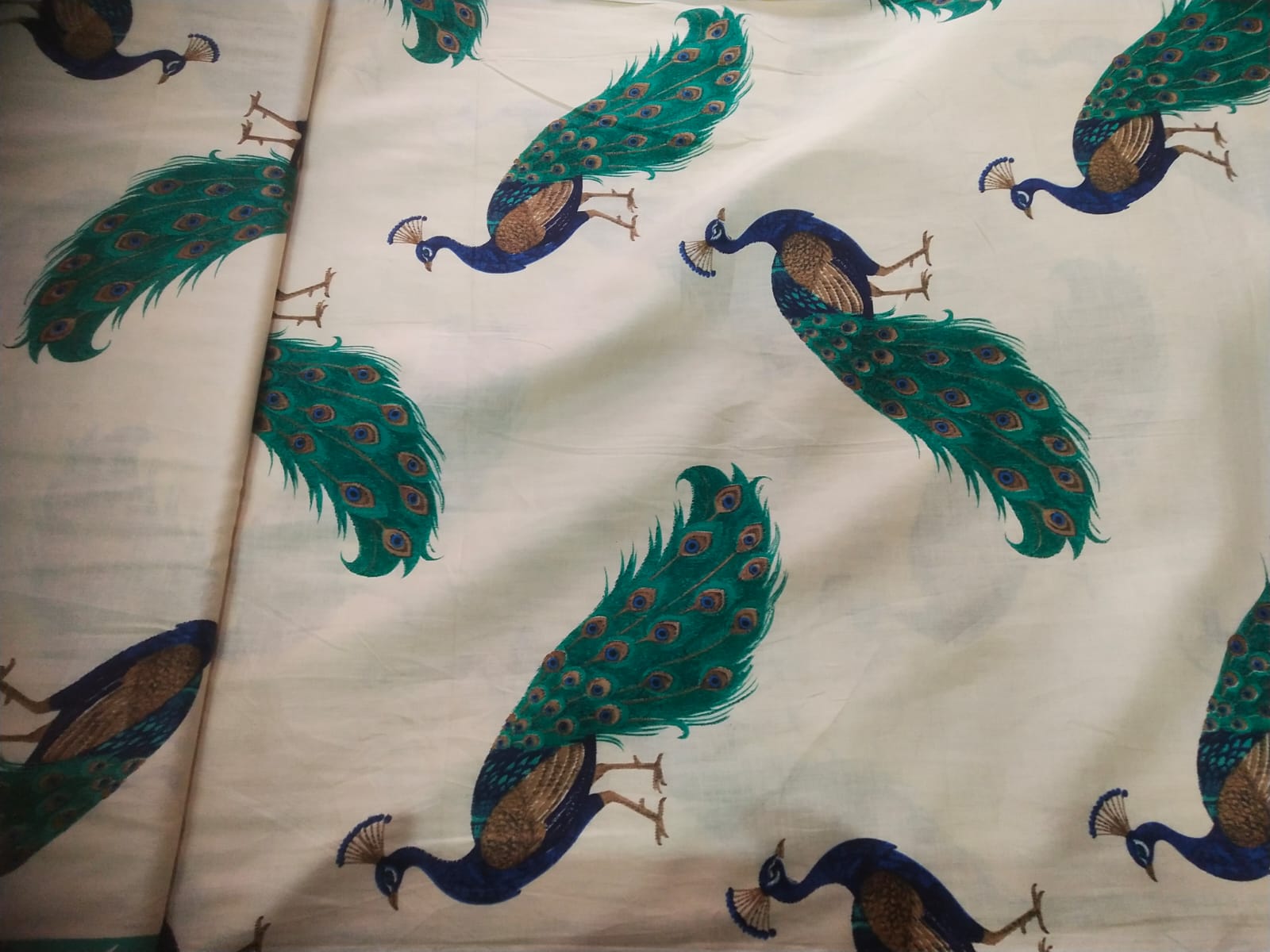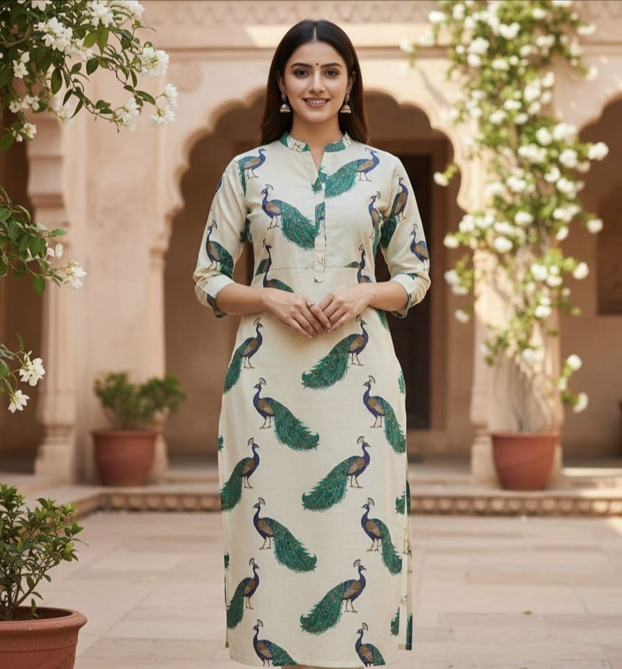 - Upgrade your ethnic wardrobe with this beautiful and elegant unstitched cotton kurti fabric. Designed with stunning peacock prints, this fabric gives a rich and graceful look perfect for daily wear as well as special occasion.